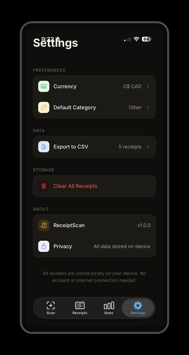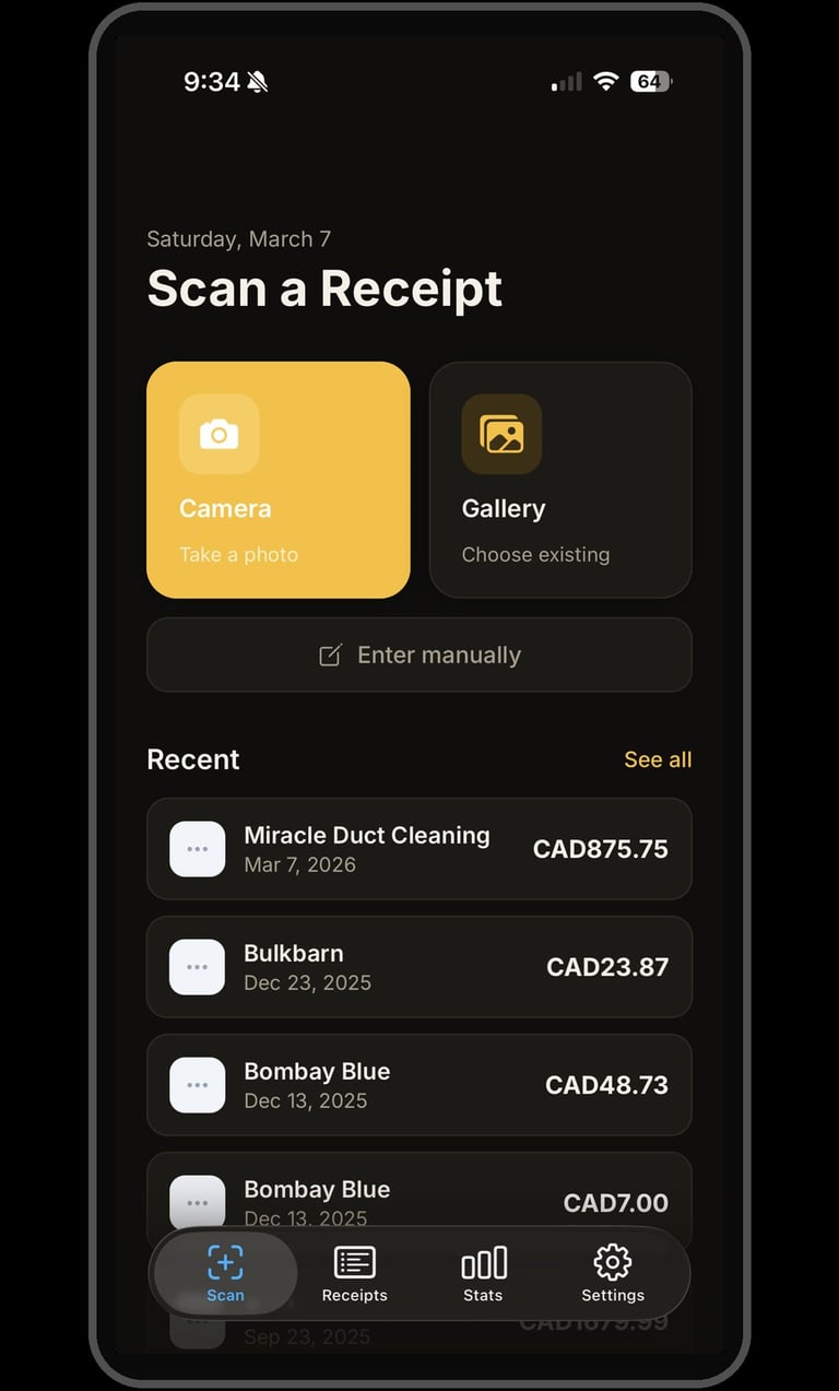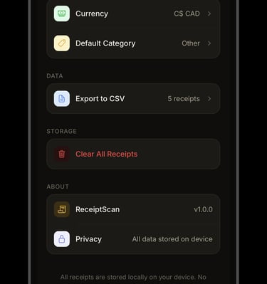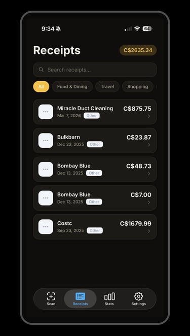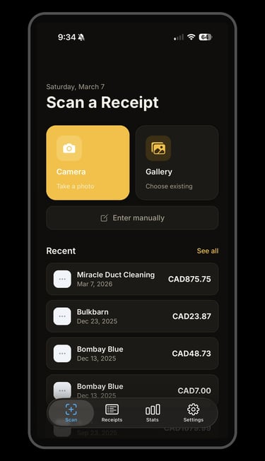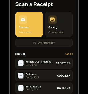 ReceiptScan makes expense tracking effortless. Simply photograph any receipt and the app automatically reads the vendor, amount, and date using on-device text recognition — no internet required. Auto reads may need to be reviewed for accuracy.