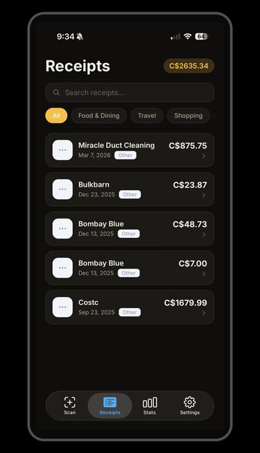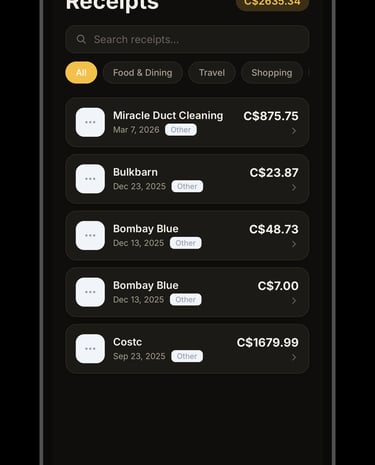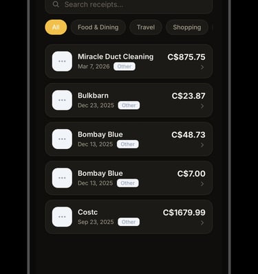 • Organize receipts by category (Food, Travel, Shopping, and more)